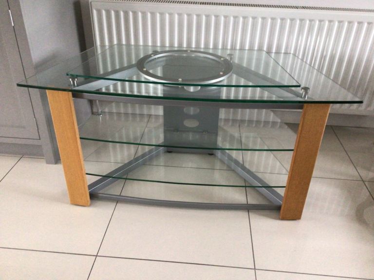 Television & Media Stand Oak, Silver & Glass Glass Top and 2 glass shelves plus a further glass turntable Good solid piece of furniture Immaculate Condition Approx Sizes: Width: 48” (122cm) Height: 23” (58cm) Depth: 22.5” (57cm)
