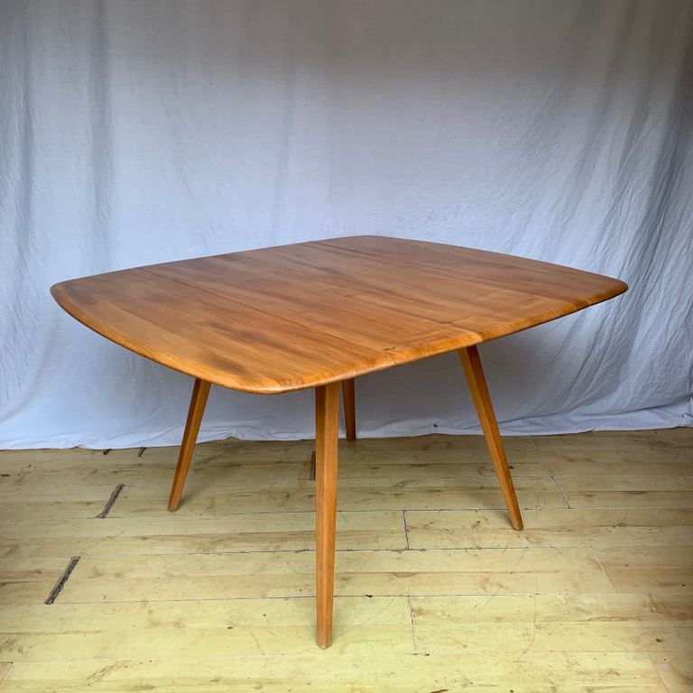 This is a relatively rare model Ercol dining table. It’s designed to have up to six around it. When one or both of the leaves are down it’s a lot smaller. The condition is very good. I’ve just added another few layers of finish.