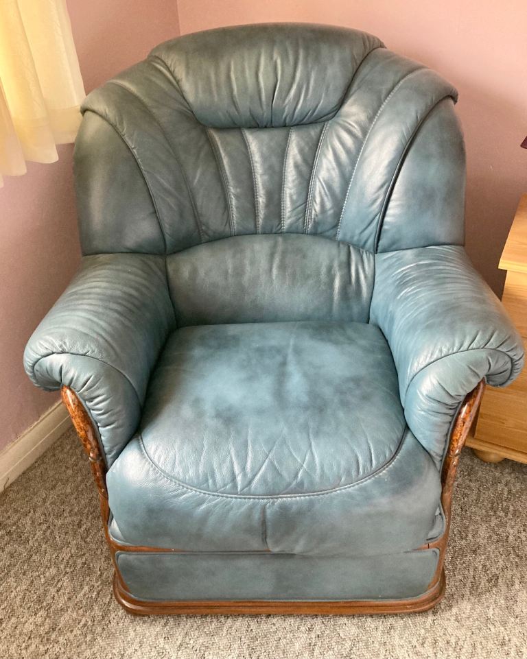 Leather Arm Chair - Teal Colour - Darker than the photos show - Wooden feet and edges. Hardly Used - Collection Only Kings Lynn