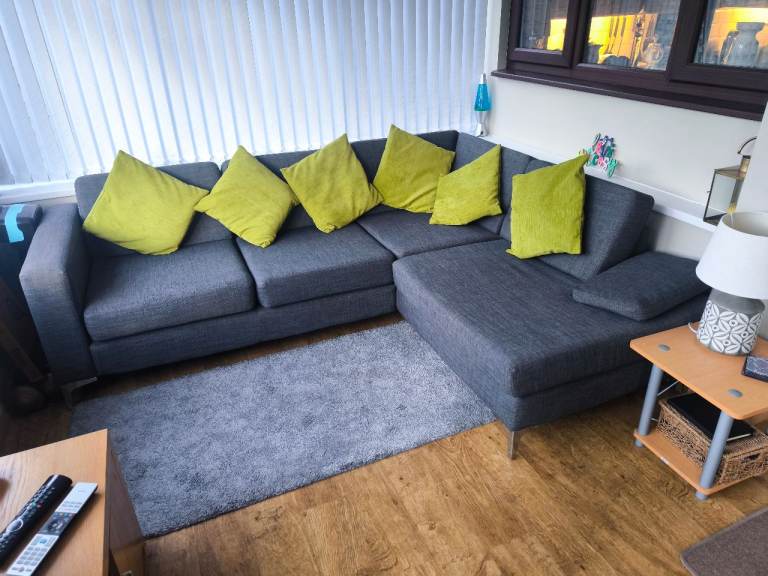 This is a comfortable corner sofa which has been used in our conservatory for a number of years and has therefore not had a great deal of use The sizes are show in the pictures It is free of stains, rips or cuts Only the grey seat cushions are inc