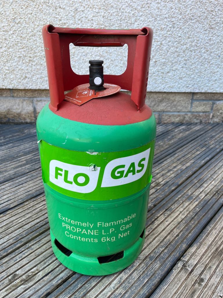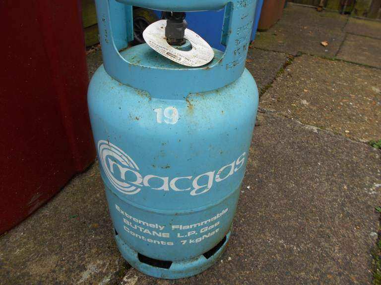 Blue butane 7 KG bottle containing some gas. MacGas / FloGas. Suitable for caravan , camping , heating in home etc. Ready for use or exchange for new bottle when empty