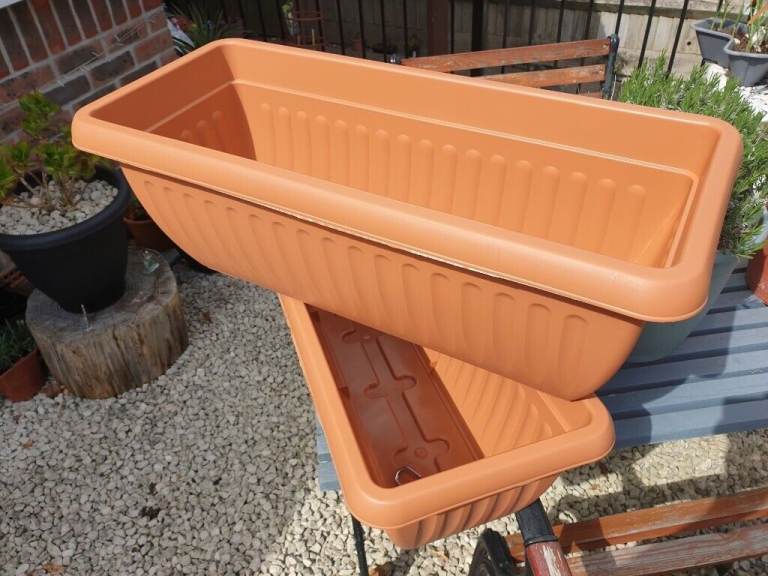 Lovely pot planters Made of very strong plastic Quantities available 27 inches long 11 inches wide 11 inches deep These would look great in any garden patio or balcony So grab a bargain Safe pick up will be arranged