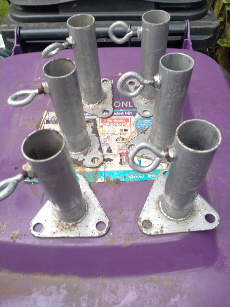 Galvanized canopy/ Frame tent / marquee foot holder 4cm Dia hole. 14cm tall tube, base 9cm. With tightening screw 6 foot holders available - £4 each Collection from West Felton nr Oswestry Shropshire SY11 4LZ.