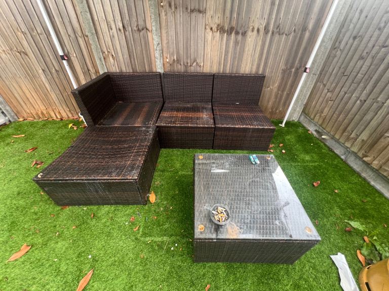 For sale is a stylish brown rattan garden furniture set, perfect for outdoor lounging and entertaining. The set includes: • 3-piece corner sofa (modular design, can be arranged to suit your space) • Matching rattan coffee table with glass top