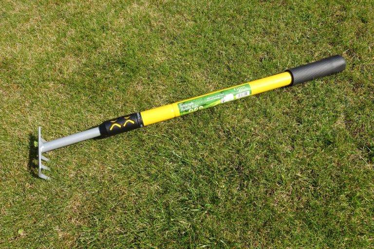 GARDEN RAKE WITH TELESCOPIC HANDLE. ADJUST FROM 25 INCHES TO 37 INCHES. SOFT GRIP HANDLE AND HANGING LOOP. AS NEW/UNUSED. #GotStuffGetCash
