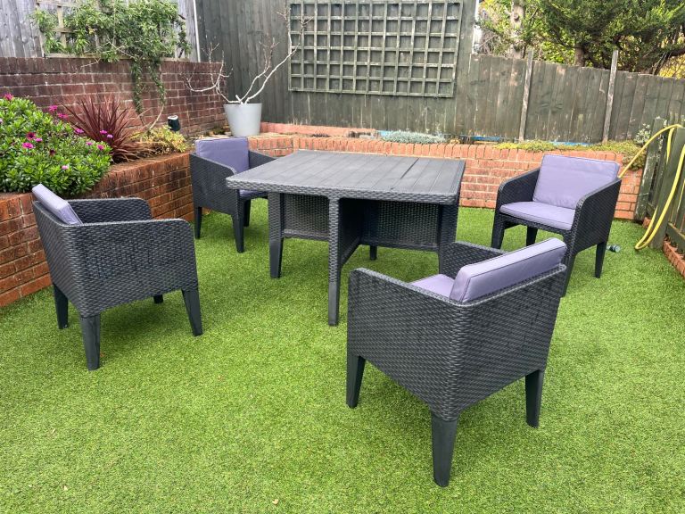 *Large plastic square garden table 116 cms x 116 cms x 76cms high * 4 chairs with arm rests (which store neatly under table) with grey cushions * seat height 43cms * colour - nearly black * great for small spaces * best transported as a unit