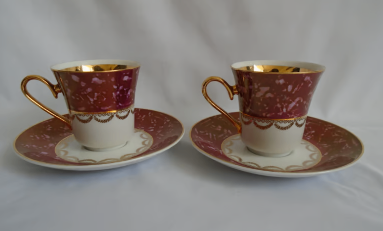 Vintage Czech JSK Hand Painted Tea Cup Saucer Set Red and Gold Bone China Vintage Czech Republic JSK Hand Painted Detail Tea Cup & Saucer Set Red & Gold Bone China 24 kt Gold detail Sets consists of: 2 x cups: 7.5cm tall x 7.5cm wide 2 x Saucer: 15