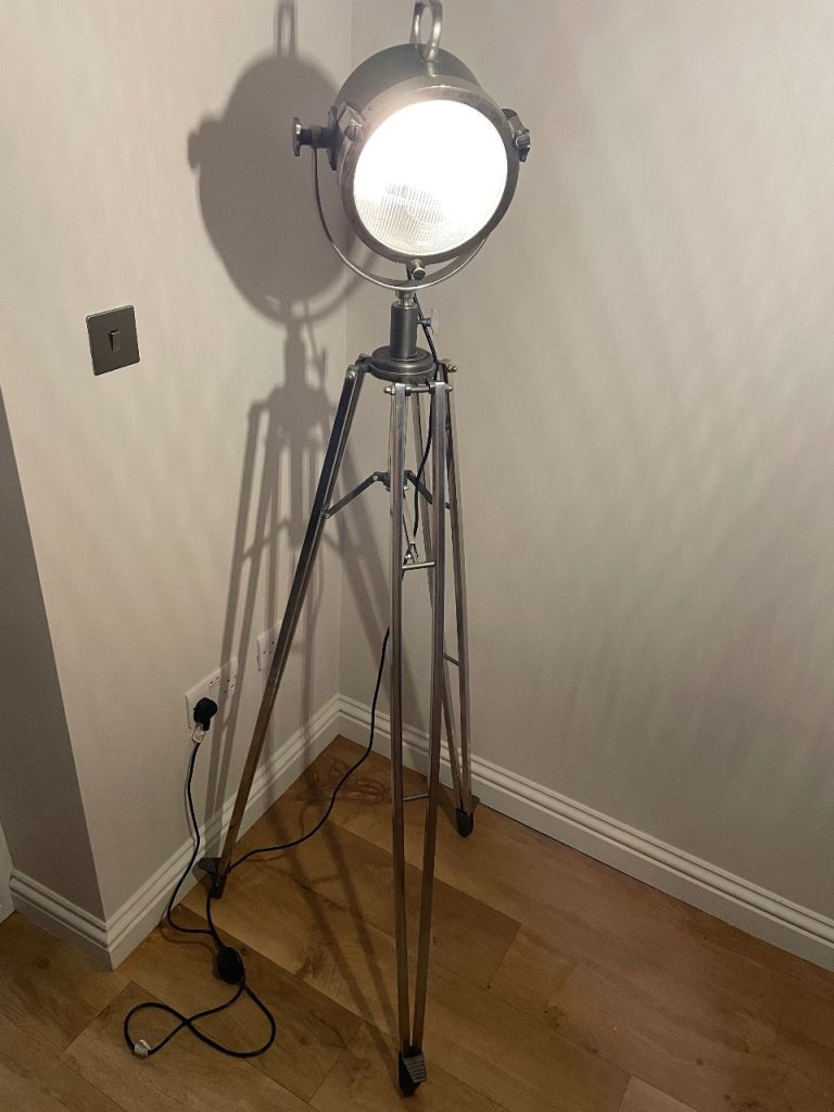 Culinary Concepts London Spotlight Tripod Floor Lamp. It is a statement piece for any room adding a touch of vintage grace. Only selling because I am moving overseas. Mains powered Lamp. 240 Voltage. Screw fitting. E27 25W bulb included. Foot