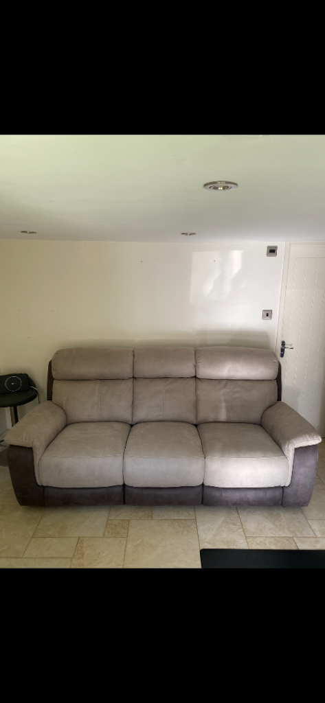 3-seater recliner sofa in a nice brown/beige colour combo. Recliners work fine, cushions are good. Happy for collection or can arrange courier delivery at buyer's cost. Open to reasonable offers, need it gone.