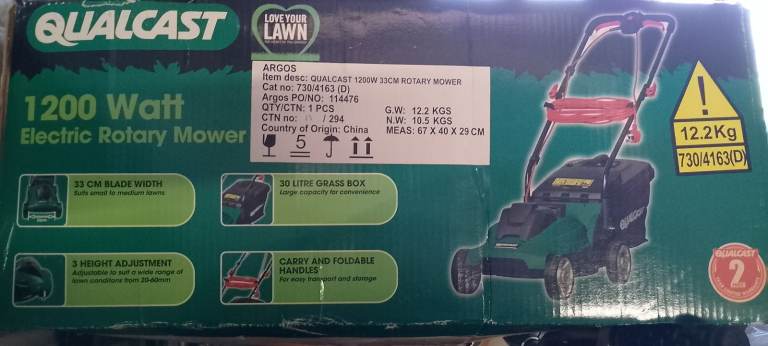 QUALCAST 1200W electric rotary mower for sale. 33cm blade cut, 3 height adjustment, 30 litre grass box, carry and foldable handles. Like new just used a couple of times.