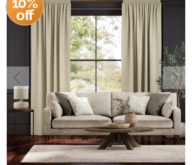 A lovely neutral pairs of curtains, bought 3 years ago, ideal for patio doors or large window. 270cm width x210cm drop Light filtering lining Pencil pleat heading 80% polyester 20% linen
