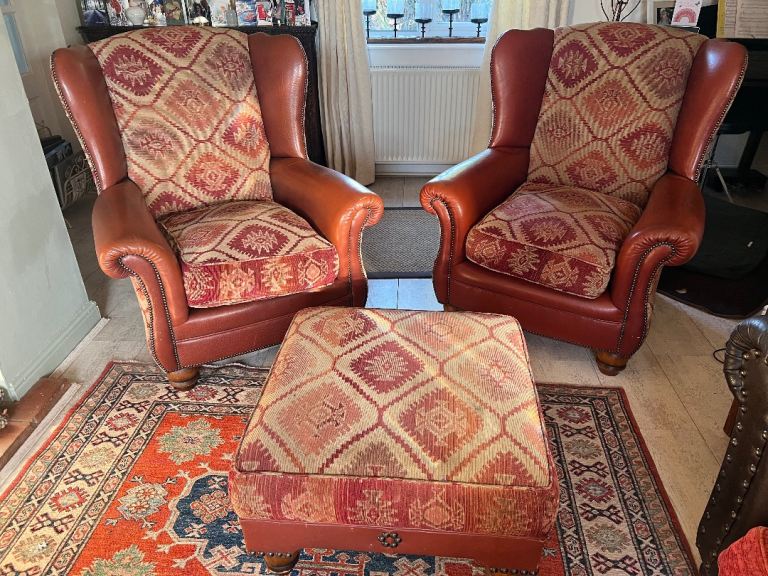 Excellent quality chairs and matching footstool. Good condition, very comfortable in warm shades of terracotta and reds. Leather arms and wings, solid wood legs. Seat cushion covers removable and washable. Would prefer to sell as a set, but may co