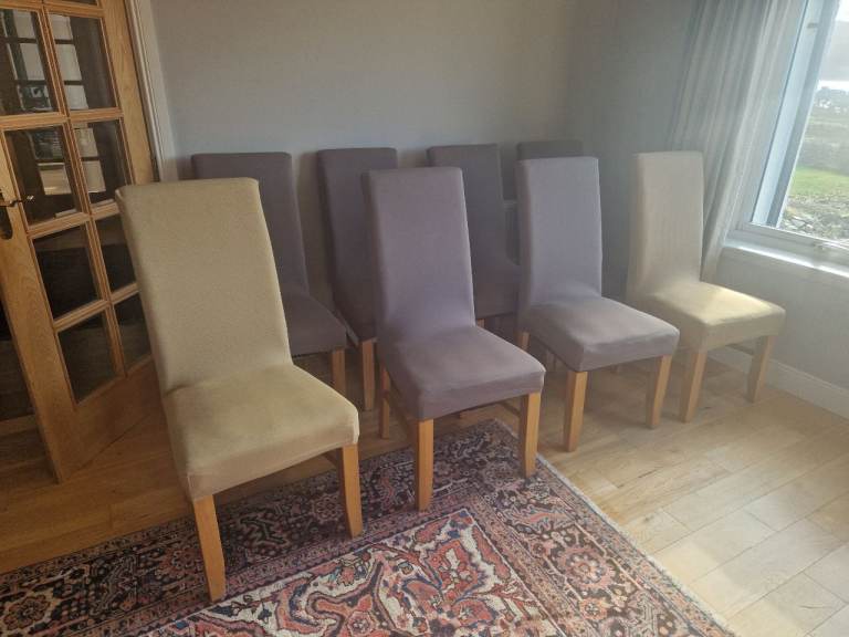 8 Dining chairs with washable stretch covers. The original faux leather covers have disintegrated (probably due to sun exposure as they were next to a big window) but the chairs look fine with the covers on and are in good solid condition otherwise.