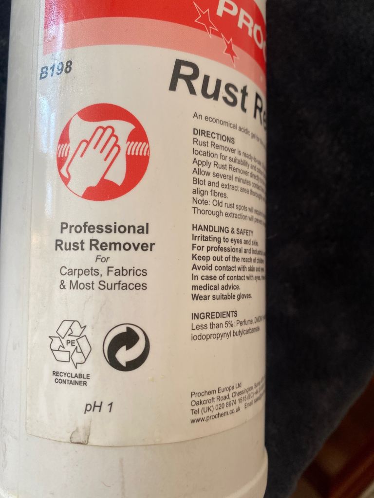 2Professional Rust RemoverProfessional Rust Remover for Carpets, Fabrics & most surfaces New Prochem £8 each Discount for bulk buy Westcliff-on-Sea, Essex£8