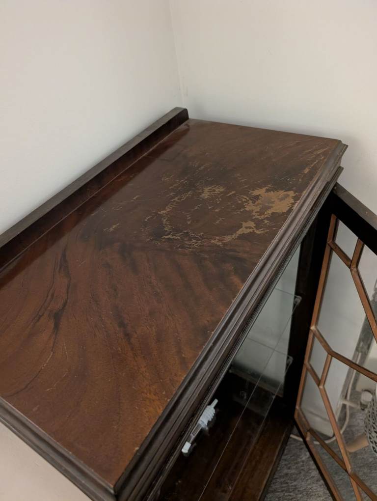3 tier drinks dark wooden cabinet with lockable glass door and glass sides 2 Glass shelves Antique style Some water damage on top, see picture Used as a drinks cabinet but could be a general display cabinet Collection only, would advise