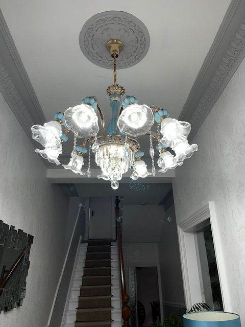 2 x chandeliers, one larger, genine crystal and blue/turquoise porcelain