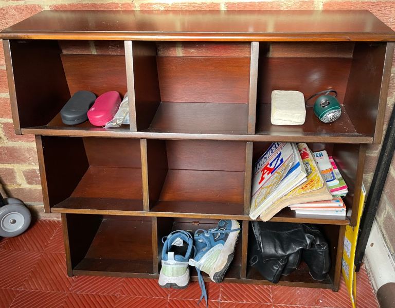 Amazingly roomy shoe cupboard for maps, torches, umbrellas, gloves etc. Beautiful wood. 81 cm wide x 21 cm deep x 72 cm high.