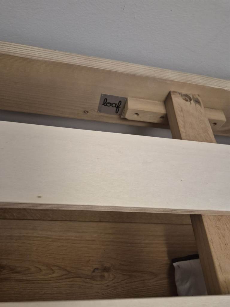 "Loaf" king size bed base in solid whitewashed oak. Perfect condition. Oak underbed storage boxes fit perfectly underneath. Dimensions: 225cm (length); 37cm (height); 151.5cm (width). 2 "Loaf" underbed storage boxes. Perfect condition. Solid oak.