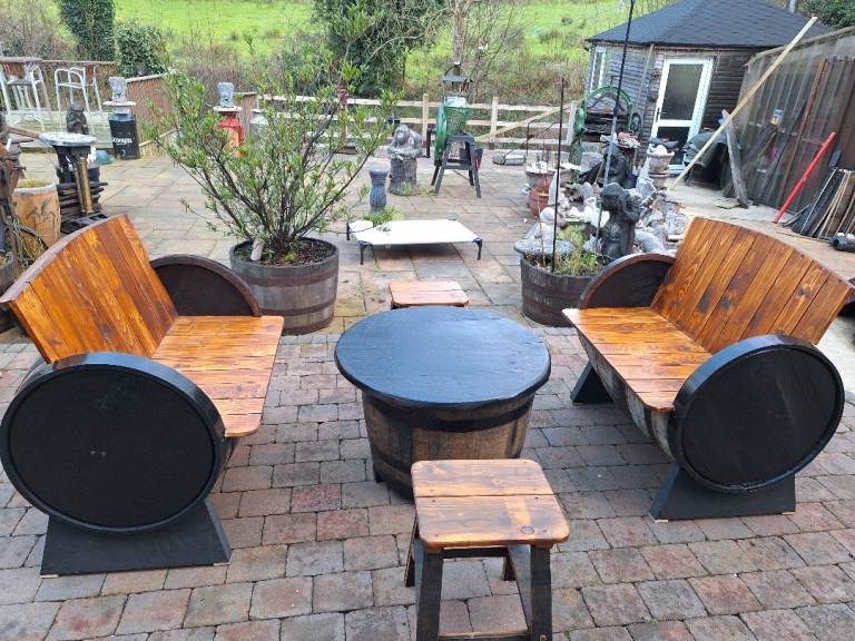 Lovely oak barrel garden furniture made from 1st class freshly emptied oak barrels seats are around 36 inch wide,circular table with concrete top which has a lovely wood grain effect, painted and laqured..£320 for 2 seats and table or its £370 with