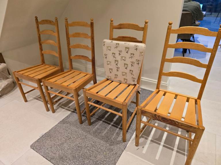 4 Ercol pine chairs with seat cushions, which measure 18 x 16ins wide and 39ins high (450 x 40 x 1000mm high), all in good condition for their age.