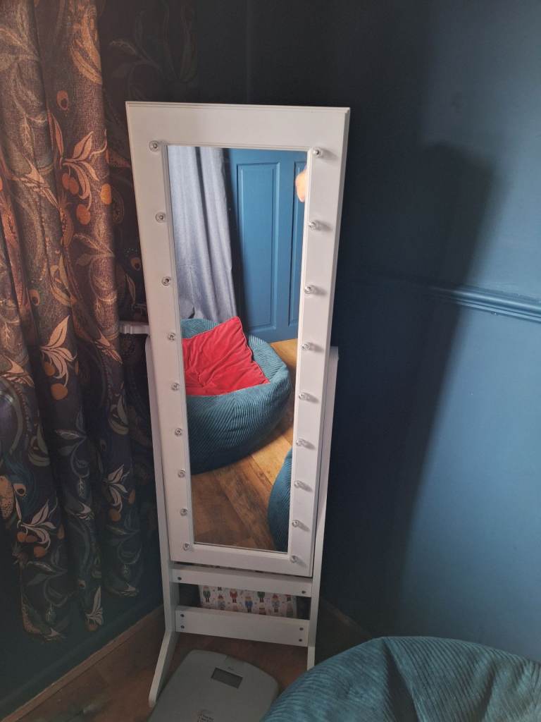 Opens up to store jewellery, make-up etc. Lights around the mirror.