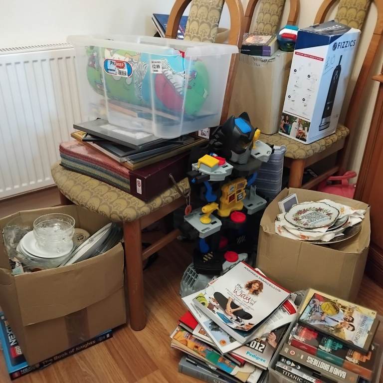 Mixed job lot of miscellaneous items ideal for a car boot sale. Including dvds, toys, crockery, books, chairs and other miscellaneous items