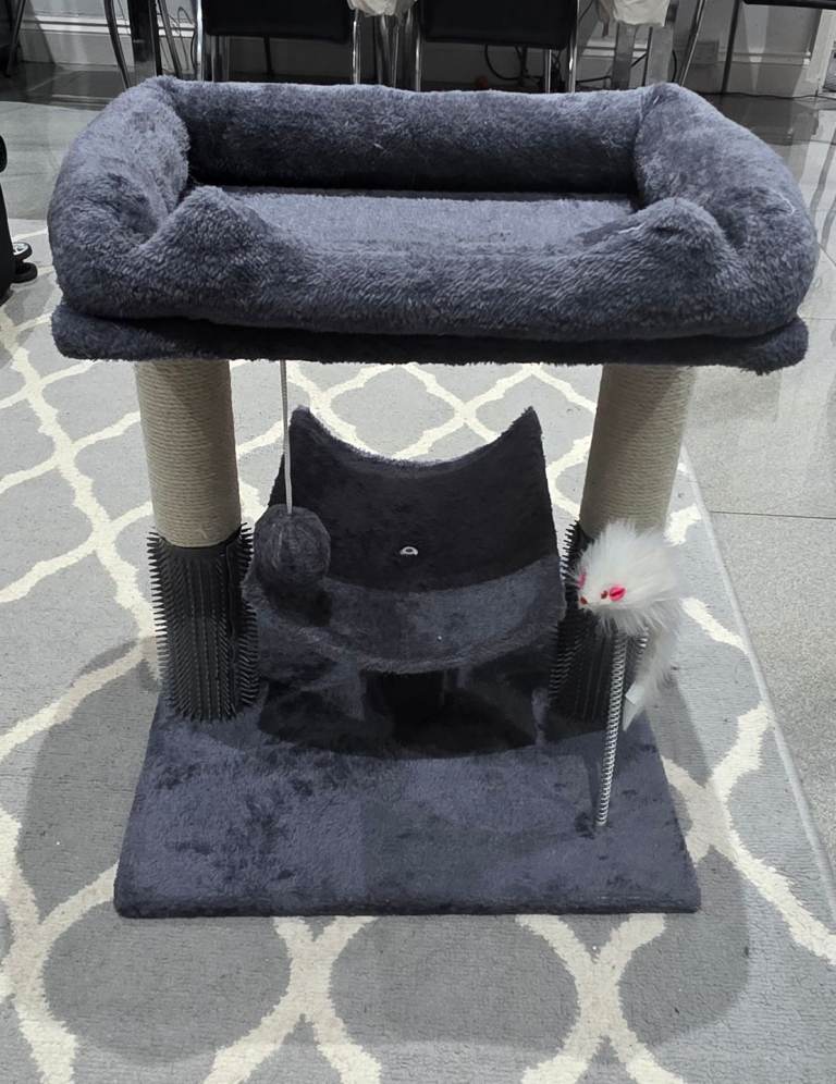 Beautiful scratch post with bed for kitten/cat Also has a silicone iching tool attached No longer using as cats have other favourite spots I have 2 of these 1 is slightly damaged on the bottom as shown in pic. In excellent condition had them