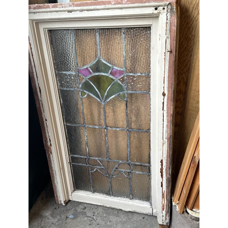 Stained glass in very old wooden frame, slight break in piece of glass you can see in photo. Not sure the frame can be reused? Glass 17” by 33”. Wooden frame is 24” by 40” It’s beautiful glass with some cracks see all photos for condition. Buy
