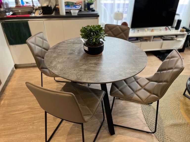 For Sale Sofá Bed by Made (it has a cut in the corner done when being unpacked..see pic) £150 900 diameter coffee table by Made £90 1200 Diameter Dinning Table and Chair set in Taupe beige colour( chairs are synthetic leather not real, dinn