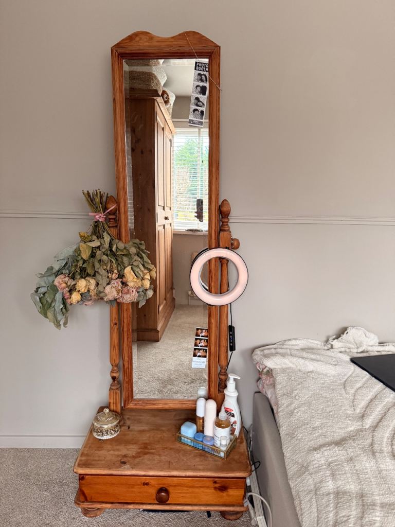 Pine standing mirror with drawer