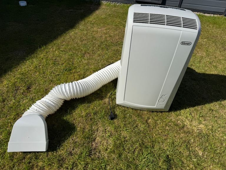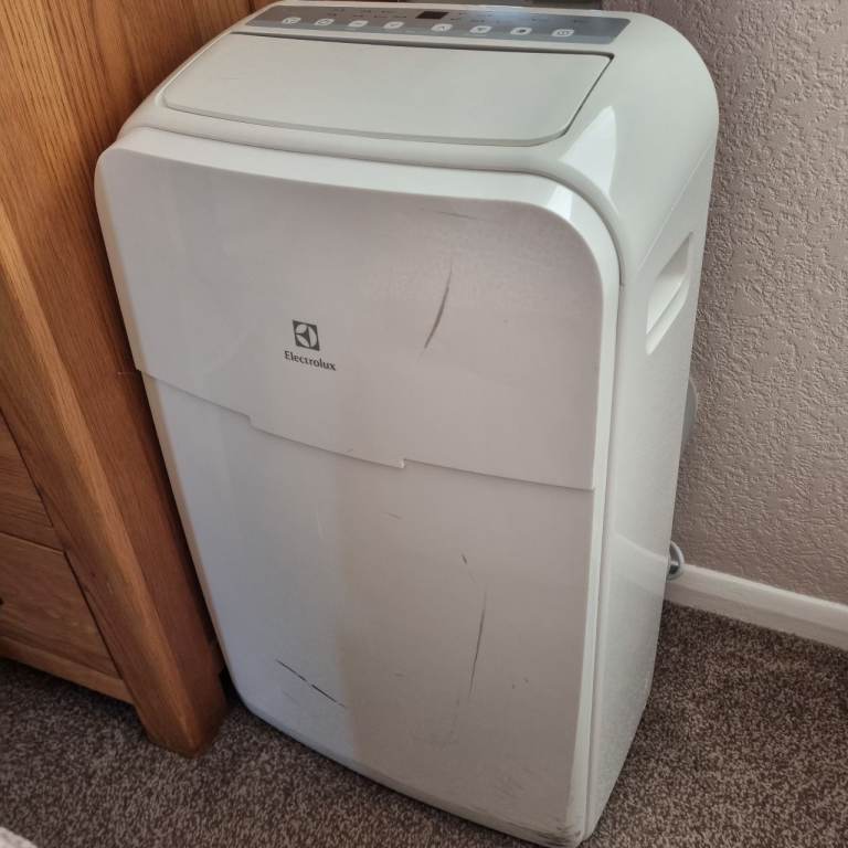 Electrolux portable air conditioner in white, model EXP09HN1WI. It's in good condition and works as it should, perfect for keeping a room cool. There are some visible scuffs and marks on the white casing from use. But these should clean off. Includes