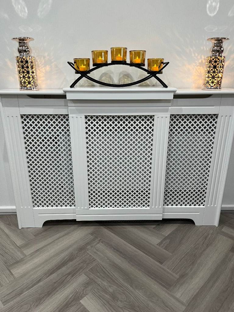 Radiator cover With One large candle stick holder at each end And five small candles in a stand The radiator cover is Height 920 on the ends and 940 in the middle Width 1415 Depth 210 on the ends and 240 in the middle it has been very well loo
