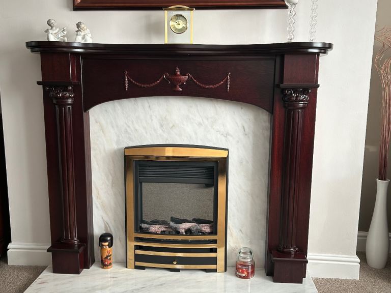 Dimplex Electric Fire 🔥 with fake coal effect and cast iron guard. Dimensions Height 24.5 inches x 21 inches wide x 10inches depth front guard to back. mock coal effect and 'moving' glow as if real flames. Photos of it shown working. Lit up ! Price