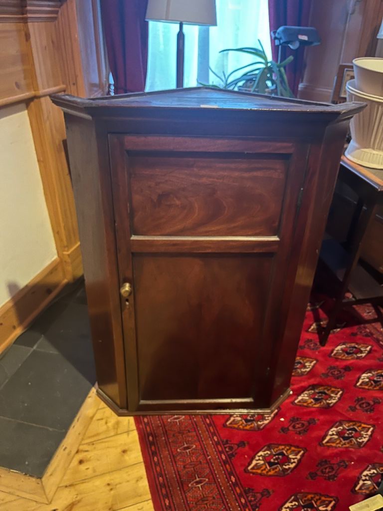 Corner cabinet approx 1 m high and 0.75 m across at front. Antique. Period unknown.