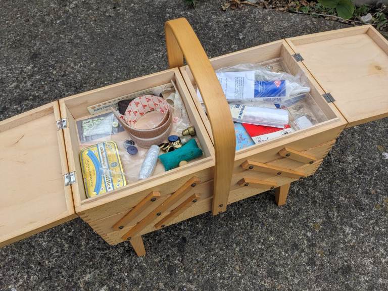 Wooden Cantilever sewing box complete with contents - collection Ipswich IP3