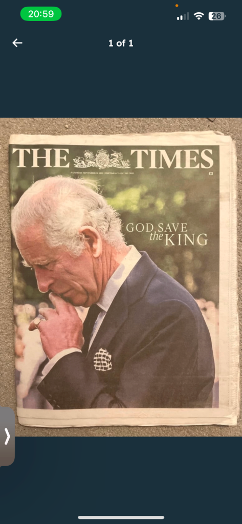 The sun newspaper, King Charles first interview after after his mother the queens death, dated Saturday 10th September 2022