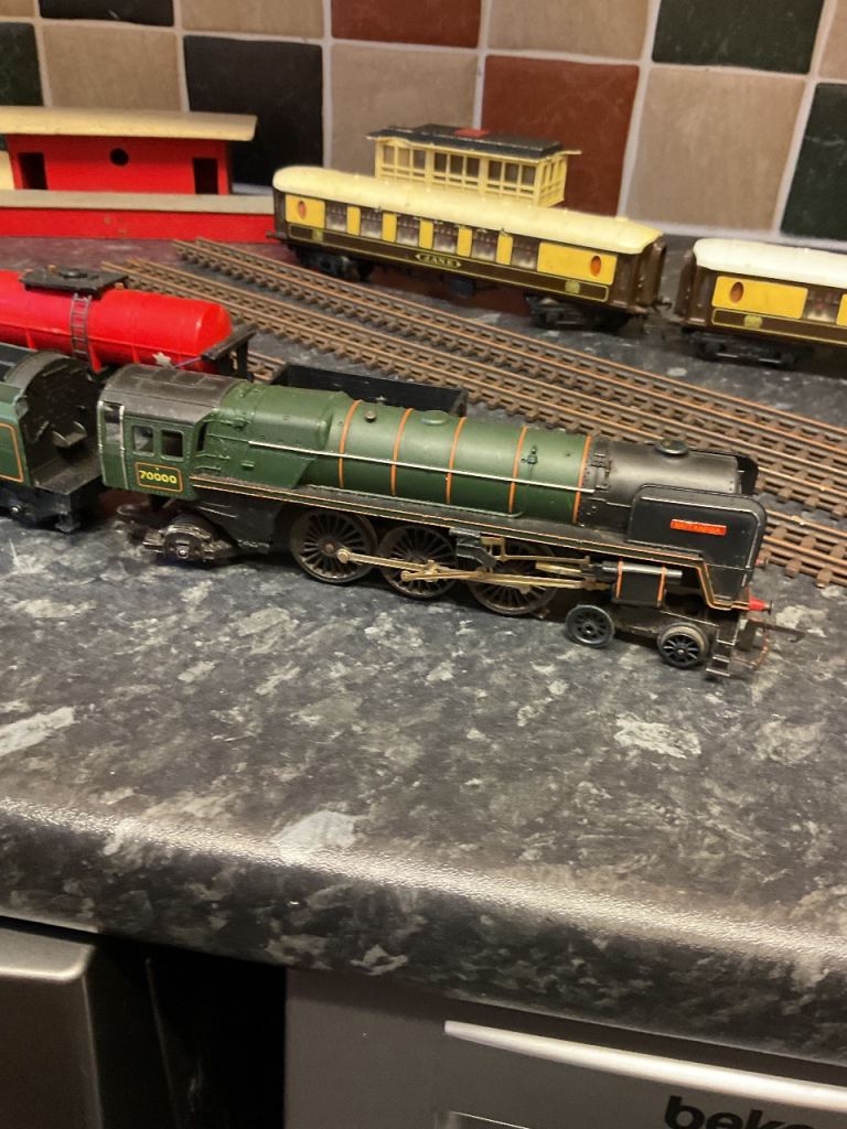 Circa 1963. Triang Hornby Britannia engine train set, includes carriages and track and some station buildings The connector from the transformer to the track is broken. Would suit an enthusiast / collector to work on.