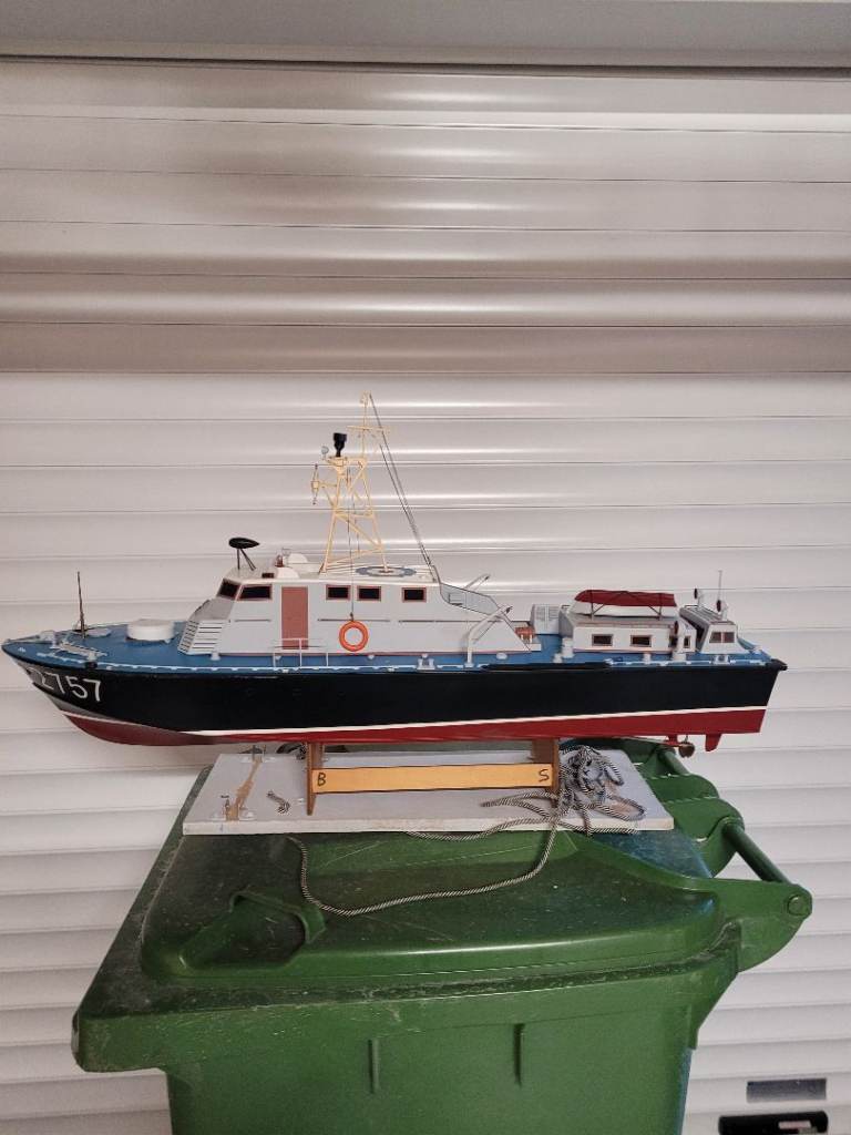 This radio controlled model rescue boat is 36 inches in length, it is complete with ALL needed items to sail it but you will need a TRANSMITTER and a RECEIVER to do so as I need these 2 items for my other boats. Boat is in VERY GOOD CONDITION the st