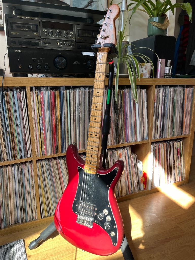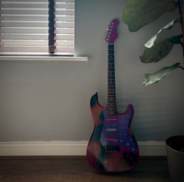 Electric guitar in good, working order. Ideal for a beginner or as a practice instrument. It's a vibrant purple colour and comes with a soft case for transport and protection. Has a few stickers on it, but these could be removed if you wanted to chan
