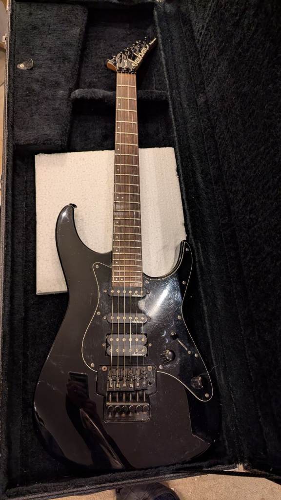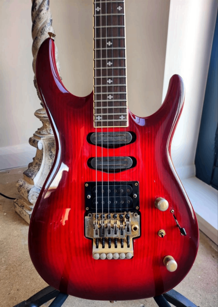 Superb 1990's Cane Prophet electric guitar, made in Korea by Samick. In great vintage condition, comes with a neck-thru body, a licensed Floyd Rose tremolo, HSS pickups with two Hotrails, and just the right amount of patina on the gold hardware.