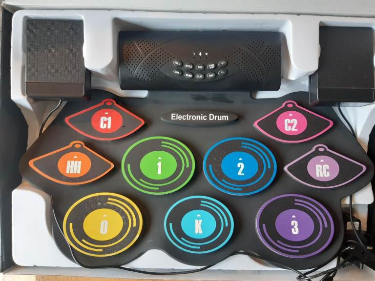 Anpro Portable Digital Drum Portable electronic drum pad with built-in battery and speakers. 9 pads. Can plug in headphones! Complete kit: Two wooden drumsticks Two pedals one for the bass drum and one for the HI-HAT functions Type C
