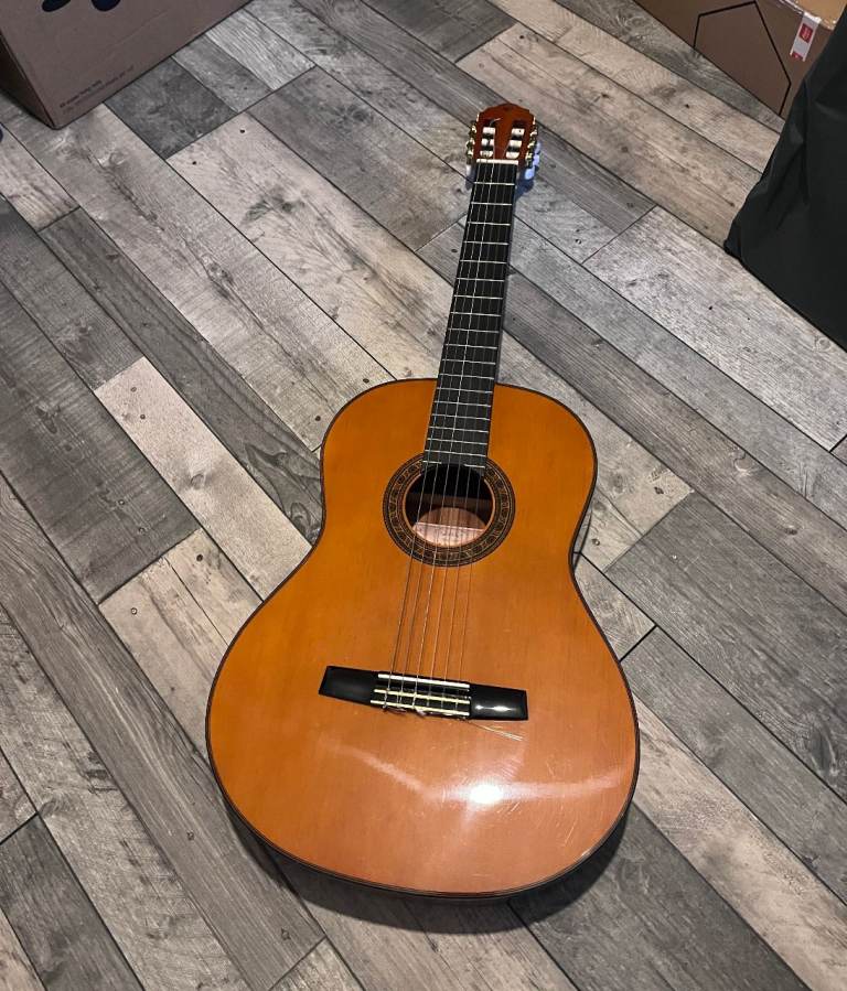 Acoustic guitar. It's been well loved so definitely has a few scratches and dents here and there, but still does everything a guitar is supposed to do! Comes with case. The case has a few paint splatters on it, but otherwise still functions. Also com