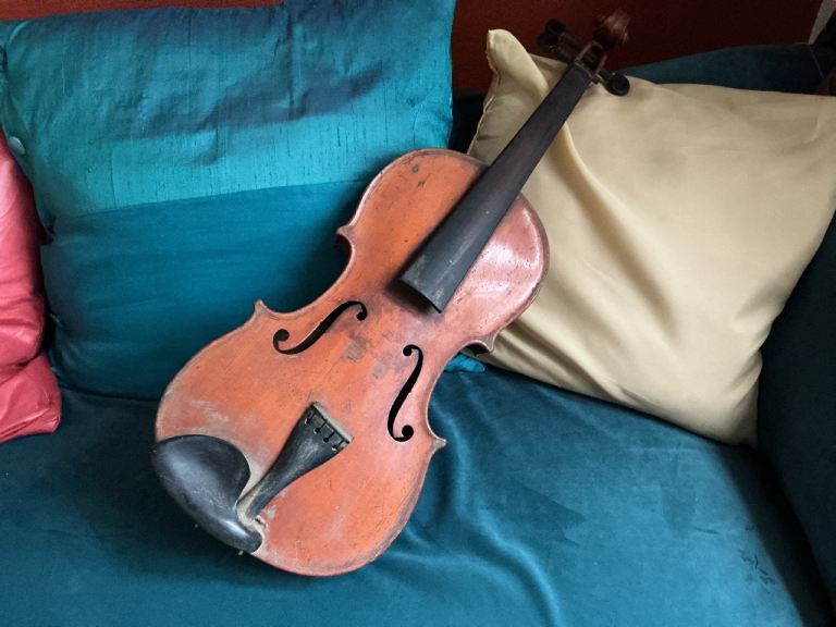 Small violin and bow, requiring restoration - strings, repairs etc Measures 59 cm in length. Based in Belfast. Collection only. Open for offers.