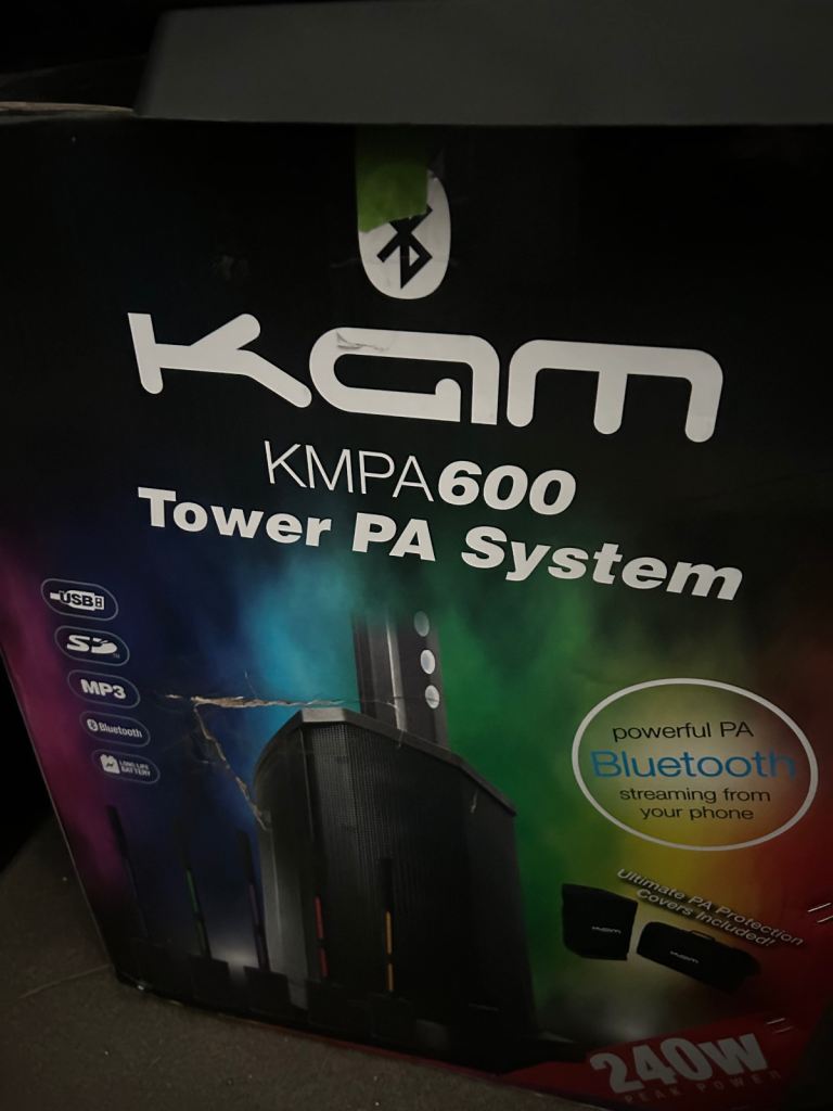 Used once at home party hence as new with box. It’s fully Bluetooth so you can stream music straight from your phone. You can also connect microphones and a guitar if needed. Great for karaoke .. Comes fully cased as in the pics.