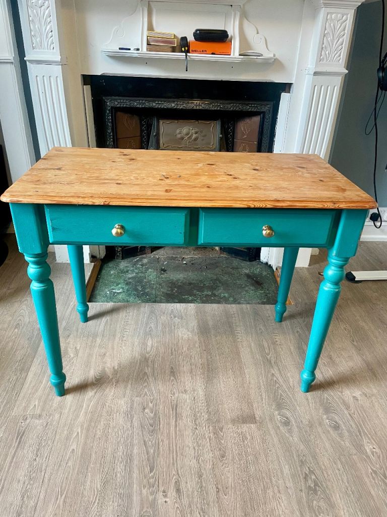 Beautiful upcycled solid wood desk with a rustic pine top and stylish teal-painted base. Perfect for a home office, bedroom, or as a statement console table. • Solid wood top with natural grain (durable + full of character) • Two spacious drawers fo