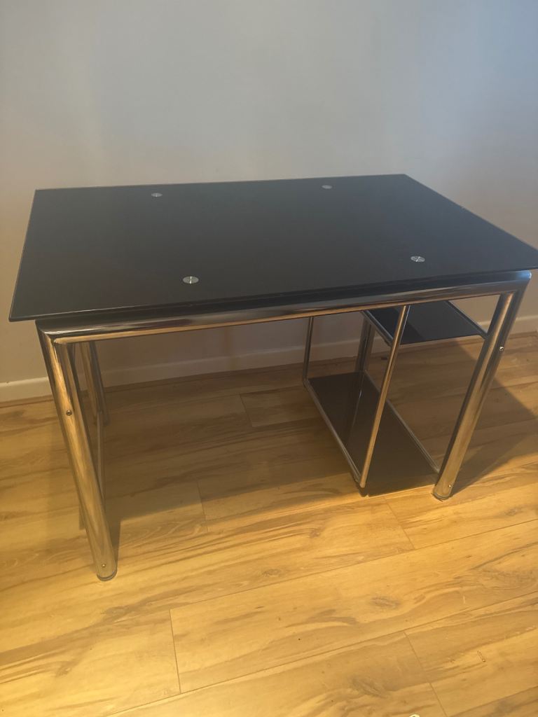 Excellent condition. No marks. Black glass top & 2 shelves. Height 80cms Width 1m 12cms Depth 70cms