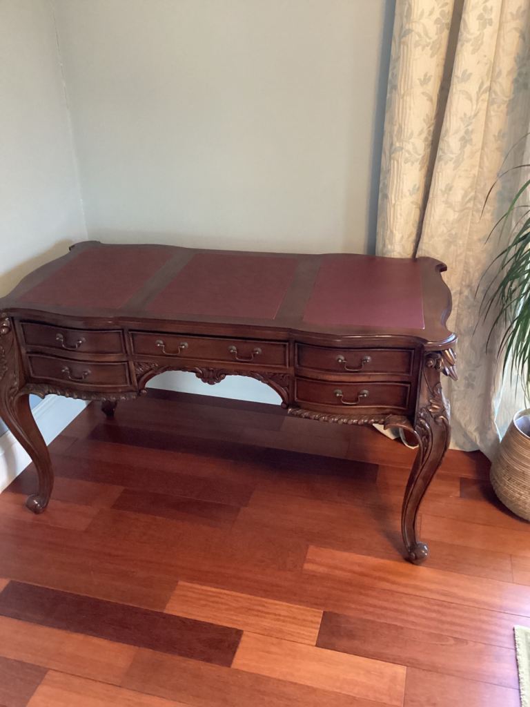 Ornate desk with red leather inlay Lovely piece of furniture. Hard wood Pick up only Any questions please ask Good condition