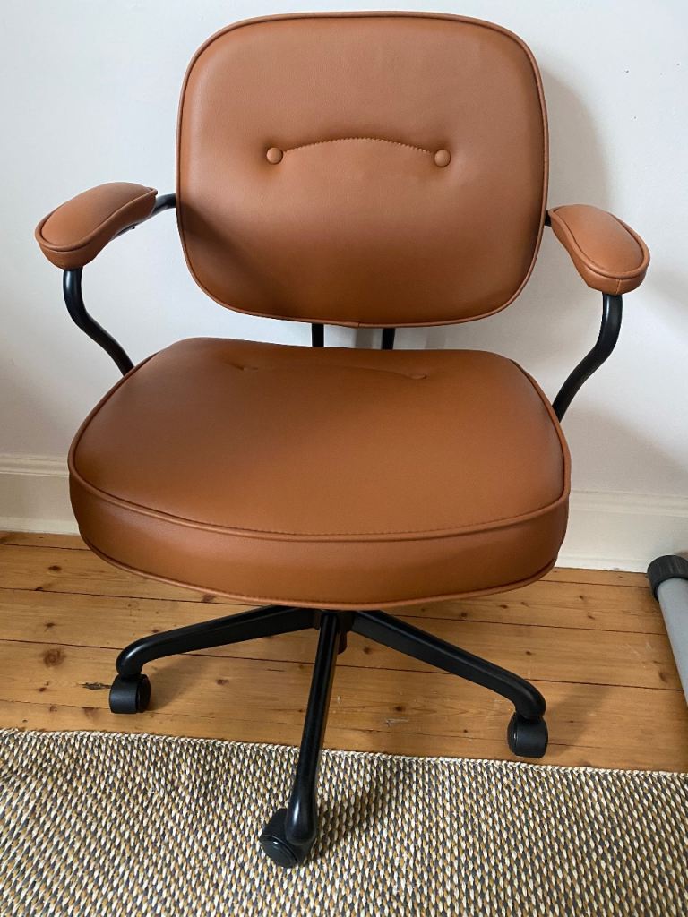 Brown vegan leather desk chair. Seat width 52cm, seat height adjustable from 41-50cm. RRP £209.99 Slightly uneven texture on backrest as shown in photo.
