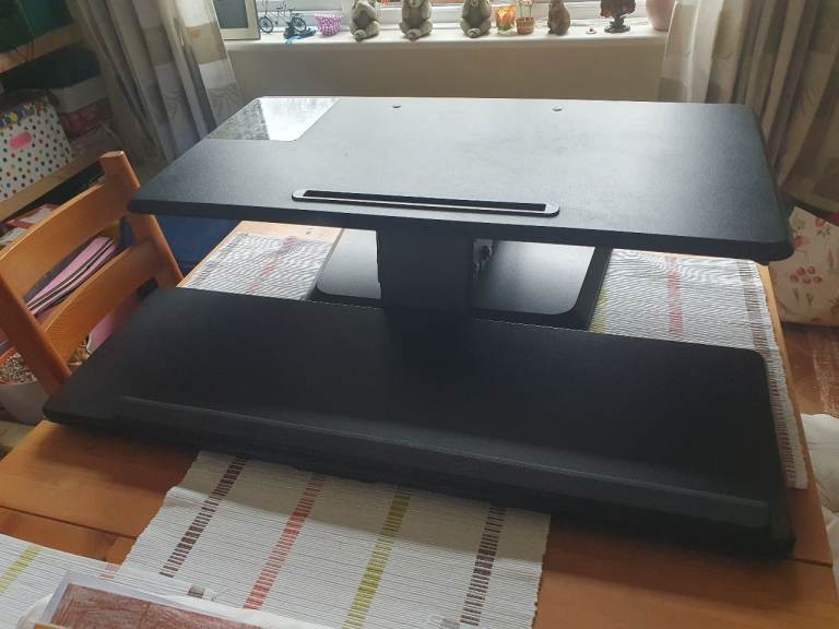 Top quality standing desk converter. Measures 80cm x 80cm when lowered, rises 35cm from lowest position. Lifting mechanism works perfectly. Collection only as to bulky and heavy to post. Can consider local delivery in Cardiff area.