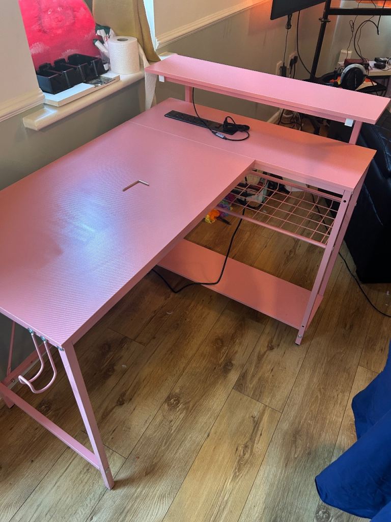 Pink corner desk, ideal for a gaming setup or home office. It has a raised shelf for a monitor and a convenient lower shelf with a wire grid for storage. Desk is in good overall condition Collection only from the SW postcode area, pleas Open to reas